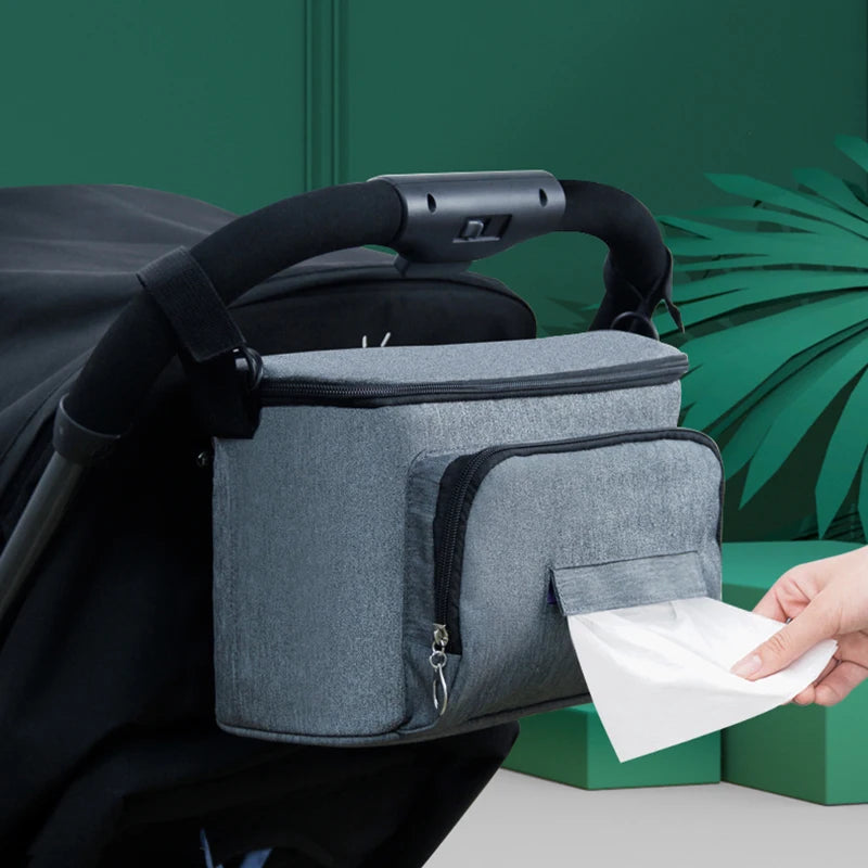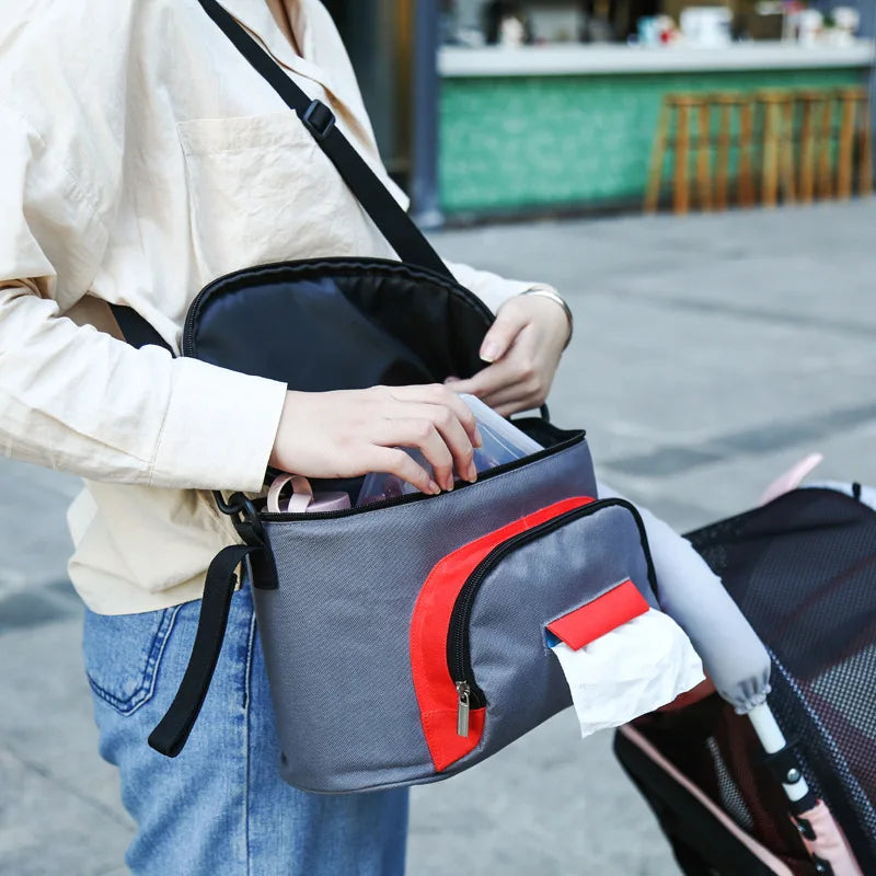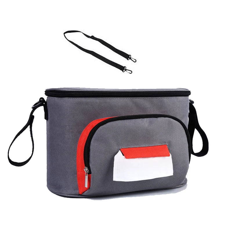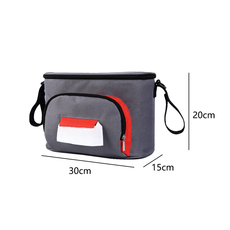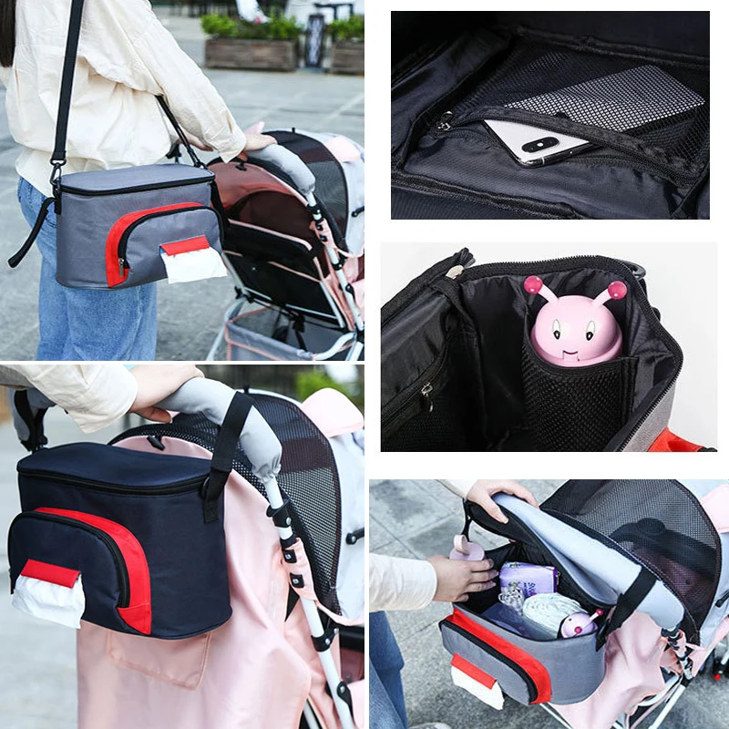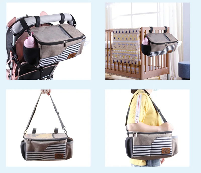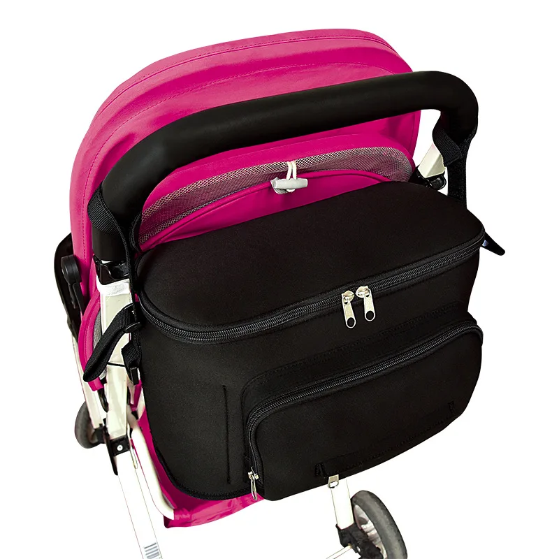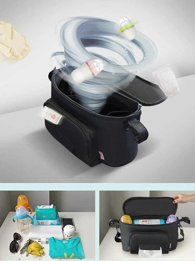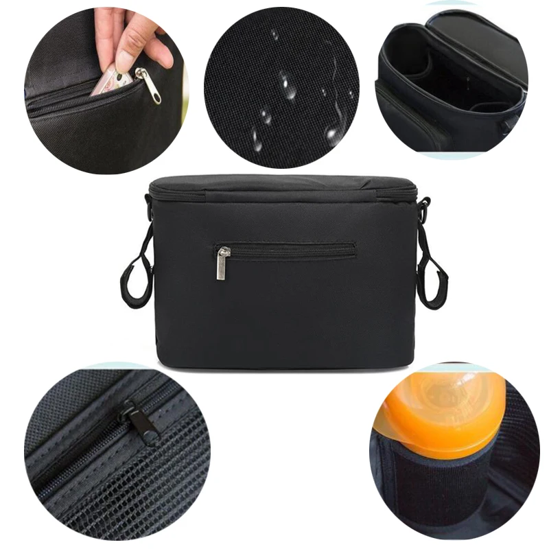 It's separated design stroller diaper bag, main bag is for baby's water bottle, milk bottle, nappy, toys, mummy's phone etc. the bag can hanging onto stroller, cart, wheelchair etc.
