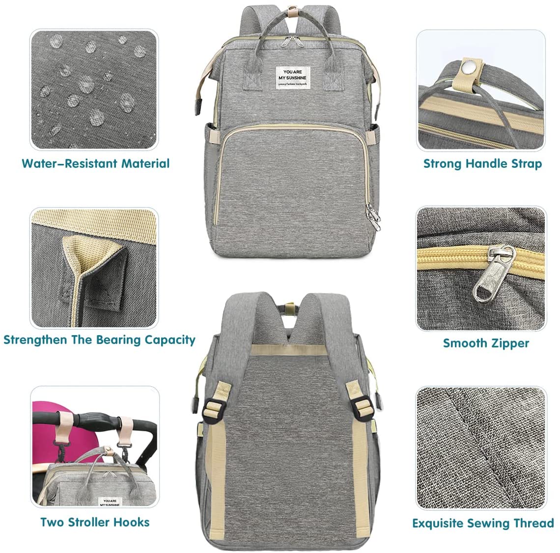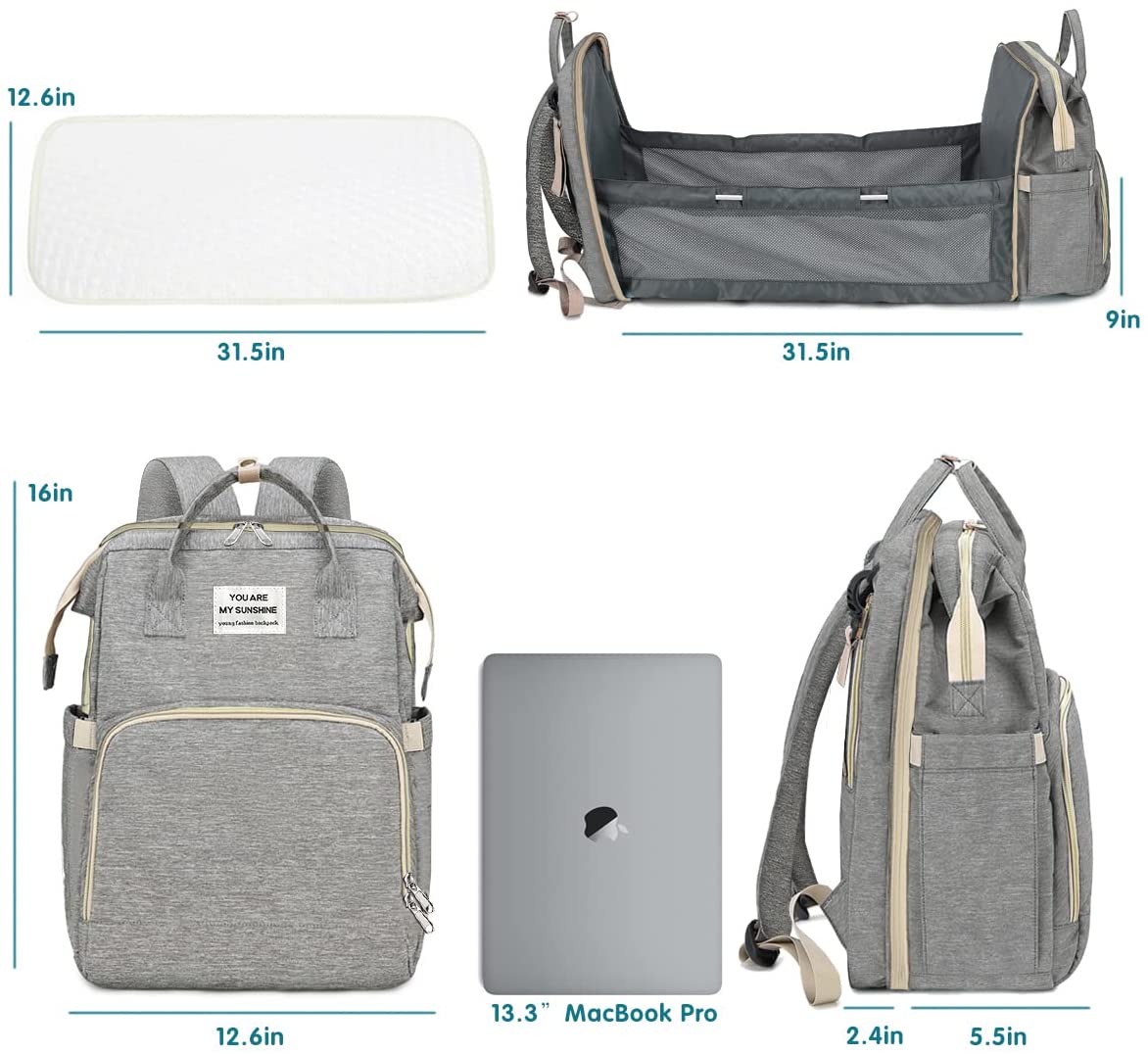 The Diaper Baby Bag is a versatile and practical diaper bag that can be used as a backpack or hung on a stroller. It is made of high quality 900D oxford fabrics and is tear resistant and waterproof. The bag has 2 main compartments and 14 functional pockets to keep baby's belongings organized and easily accessible. A mat is included for changing diapers or providing a safe and clean space for the baby to rest. The bag is comfortable to wear with cushioned shoulder straps and makes an excellent baby shower gift.