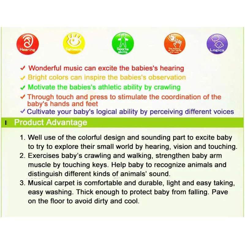 Musical carpet well use of the colorful design and sounding part to excite baby to try to explore their small world by hearing, vision and touching. Exercises baby’s crawling and walking, strengthen baby’s arm muscle by touching keys. Help baby to recognize animals and distinguish different kinds of animals’ sound. Wonderful music full exercise of baby auditory system development, cognitive instrument to help baby cultivate musical beauty.