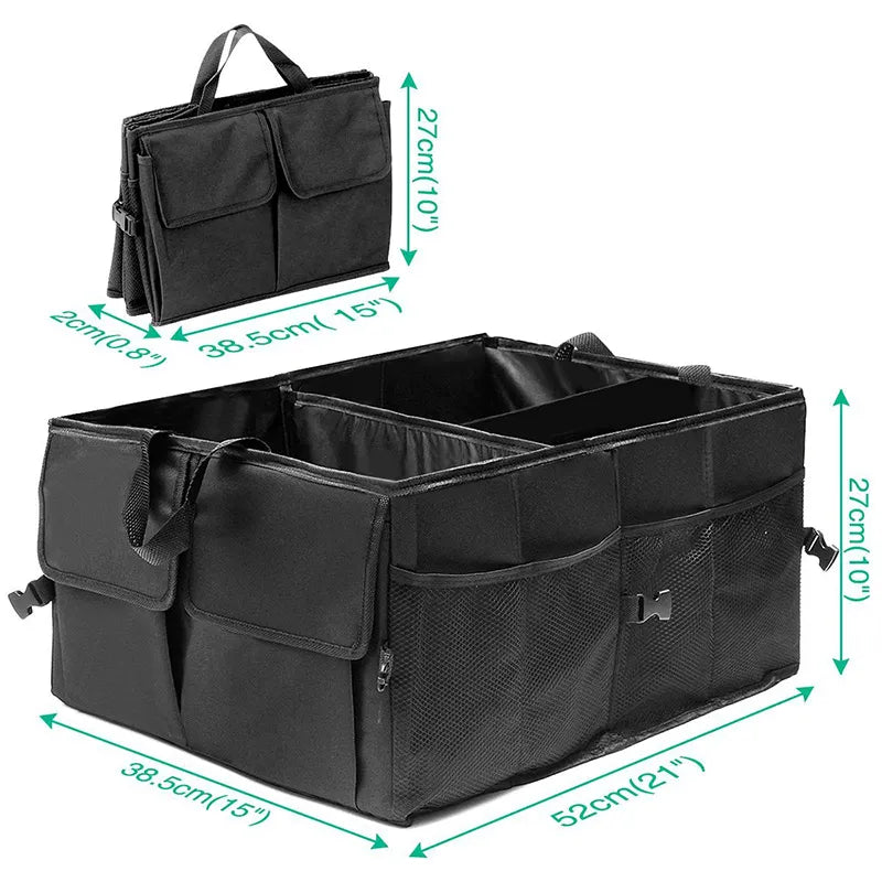 Practical, durable, anti-stain, easy to use; all kinds of tools can be stored. divided into four separate spaces, a plurality of external pockets, full use of space and resources; bottom magic button, you can paste a fixed role to play in the trunk; simple design, ample storage space.