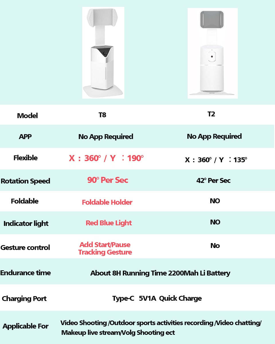 Specifications: Up & Down View Angle: 105° Tracking Take: Yes Supporting System: Both iOS and Android smartphones Support Remote Control: No Suggest Tracking Distance: ≥ 1 m Special Feature: No App Needed Rotation Speed: 42°/Sec Rotation Angle: 360° Rechargeable Battery: USB Charging Port Rated Power: 5V1A Product Weight(Oz): 7.76 Product Size(inch): 7.75(H)*2.0(Diam) Best Sensing Distance: 5M Battery Life: 8hours Battery Capacity: 2200mAh lithimun battery Battery Life: 6-8hours Battery Capacity: 2200mAh Auto AI Face: Yes Anti-Shake: Yes 360 Rotation: Yes Angle: 105