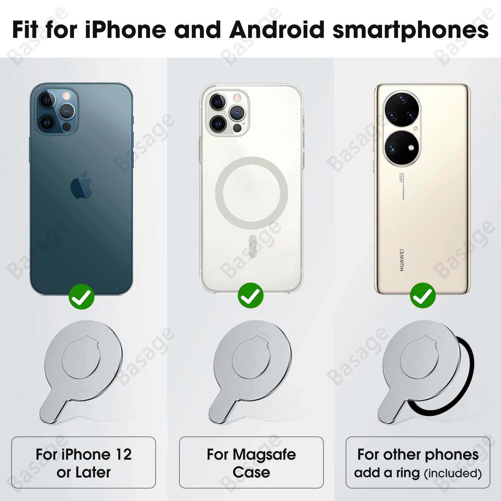 like iphone 14/13/12 pro max with magnetic suction function, you can directly adsorb and use; if not, you can use the round magnetic suction that we are equipped with to paste on the back of the phone or protective case to use. Provide customers with more choices.