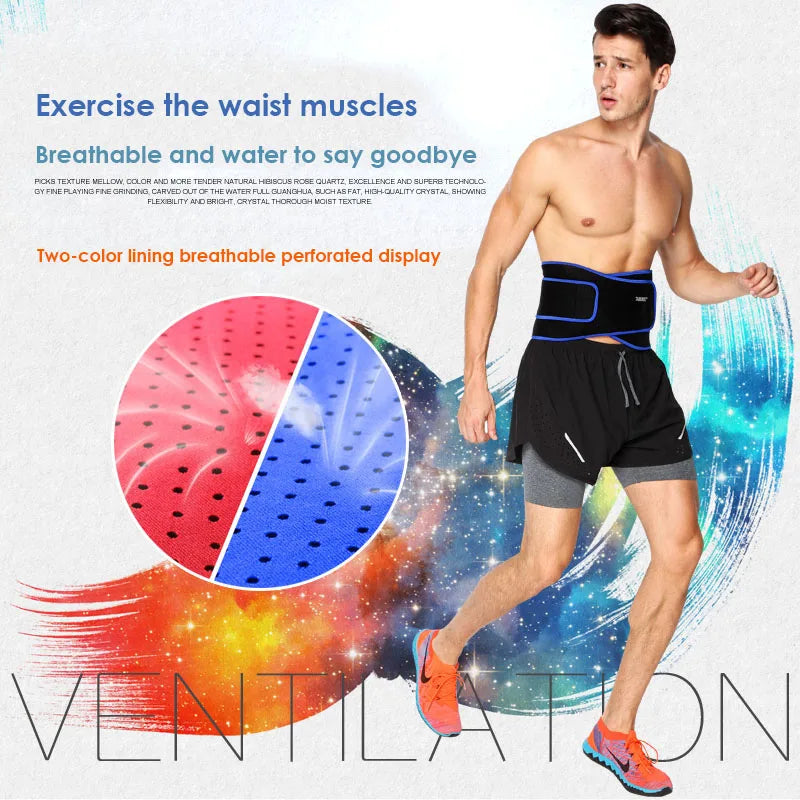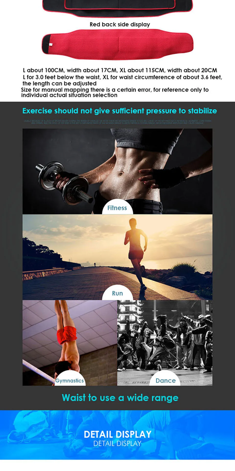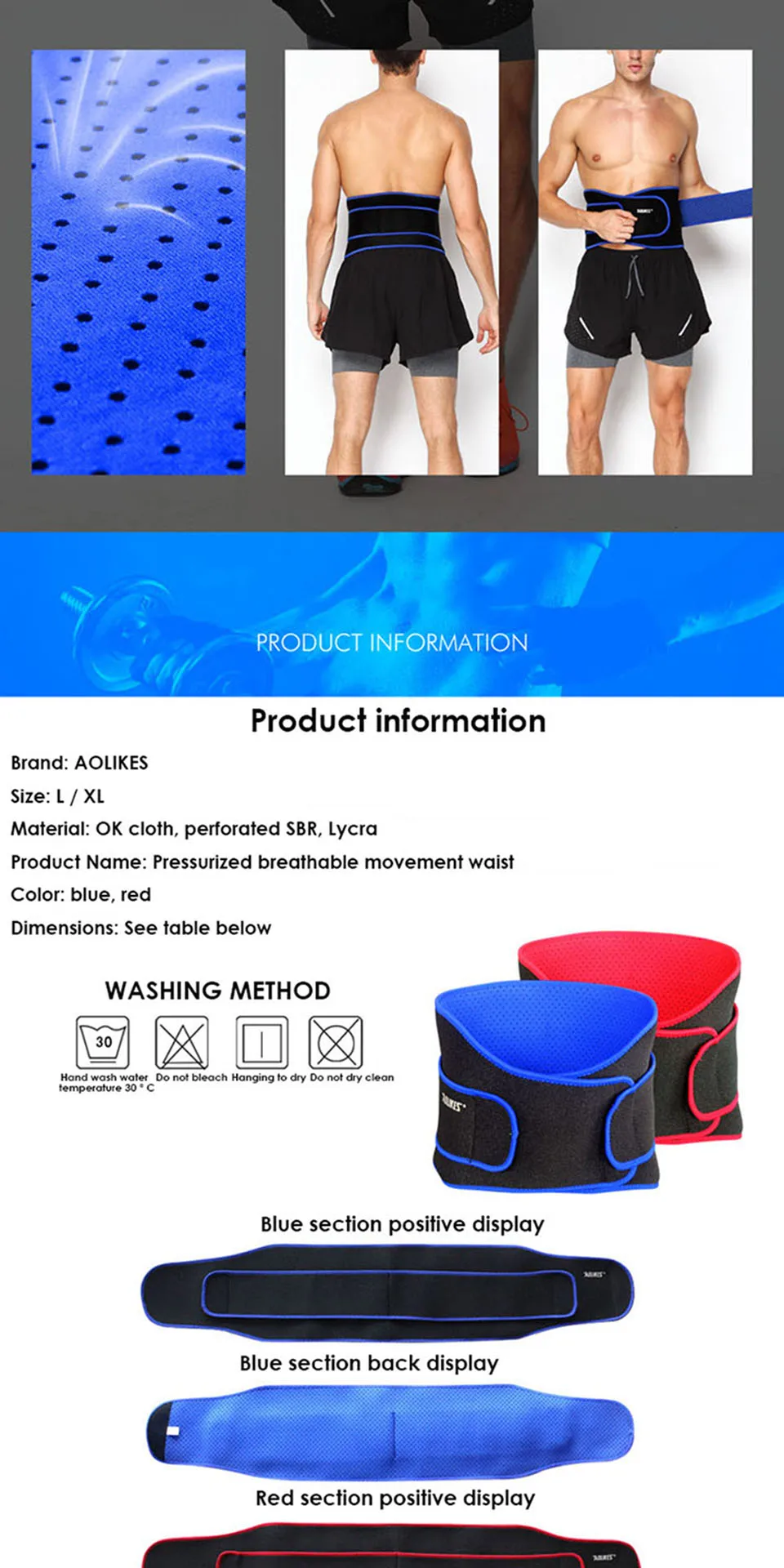 Item: Waist Support Material: Breathable perforated cloth Function: Protect Waist Color: Blue/Red Size: L: length about 100cm,width about 17cm;suit waist< 100cm XL:length about 115cm,width about 20cm;suit waist< 120cm